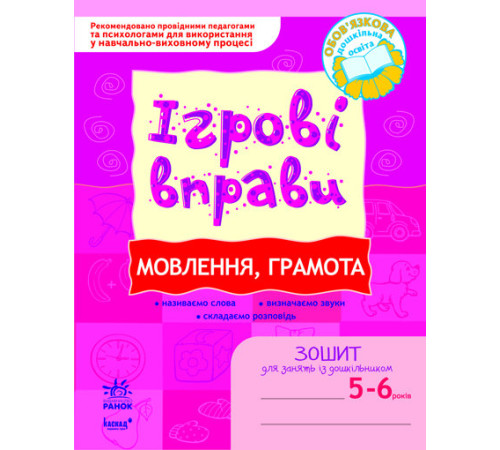 УкраїнськаНазиваємо слова, вивчаємо звуки, складаємо розповідь! «Ігрові вправи» укладені відповідно до сучасних вимог в дошкільному вихованні та освіті. Вправи і завдання побудовані на елементах гри; представлені в чіткій логічній структурі; дозволяють удосконалити необхідні навчальні навички; орієнтовані на активну діяльність дитини. Наприкінці зошита - тестова сторінка «Навчальна готовність до школи» Зошит для занять із дошкільником 5-6 років є частиною цілісного комплекту, спрямованого на комплексну підготовку дитини до школе.Еффектівная структура, доцільні умовні позначки, ігровий та багатоплановий характер вправ - ті відмінні риси зошити , які сприяють правильній організації процесу підготовки. А цікаві вправи, веселі малюнки формують інтерес дошкільника до майбутнього навчання. Цей зошит доцільно купувати разом з зошитами цієї ж серії: лист; математика; логіка, пам'ять, увагу.