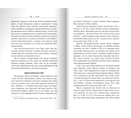 Гері ЧепменБез сумніву, більшість людей «мають проблеми» з гнівом. До того ж християни завжди дуже переживають з приводу того, що і в них виникають ці сильні й непрості емоції. Чи можуть ті, хто наслідує Христа, якось виявляти свій гнів? Що нам говорить про це Біблія? Чи може гнів хоч колись бути добрим? Ця книга – спроба викласти в доступній формі думки, ідеї та методи, котрі допомогли сотням одружених пар і багатьом самотнім людям знайти кращий спосіб опановувати гнів. Тут наведено багато реальних історій людей, яких охоплювало це почуття, й іноді ви будете впізнавати в описаних ситуаціях та розмовах обставини власного життя. Кожен з нас у змозі навчитися краще давати собі раду з власними емоціями.